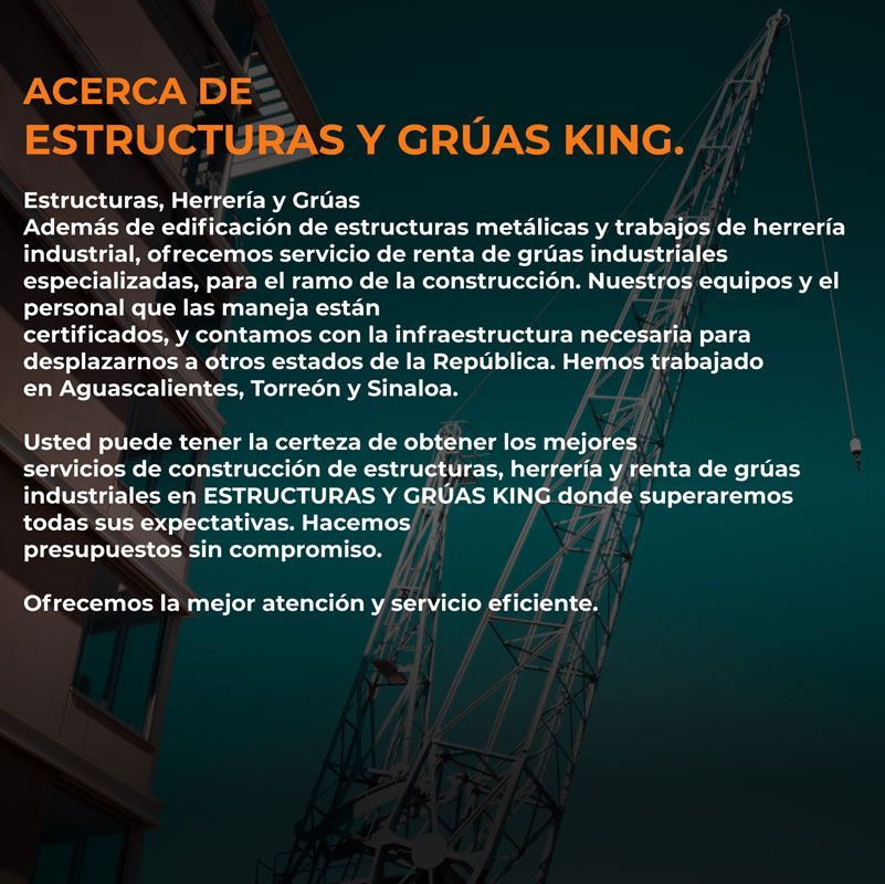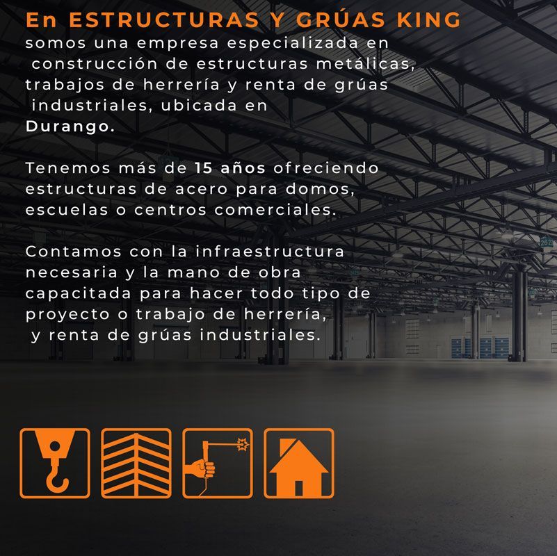 En Estructuras y Grúas King somos una empresa especializada en construcción de estructuras metálicas, trabajos de herrería y renta de grúas industriales, ubicada en Durango.